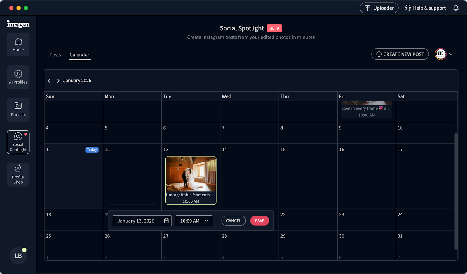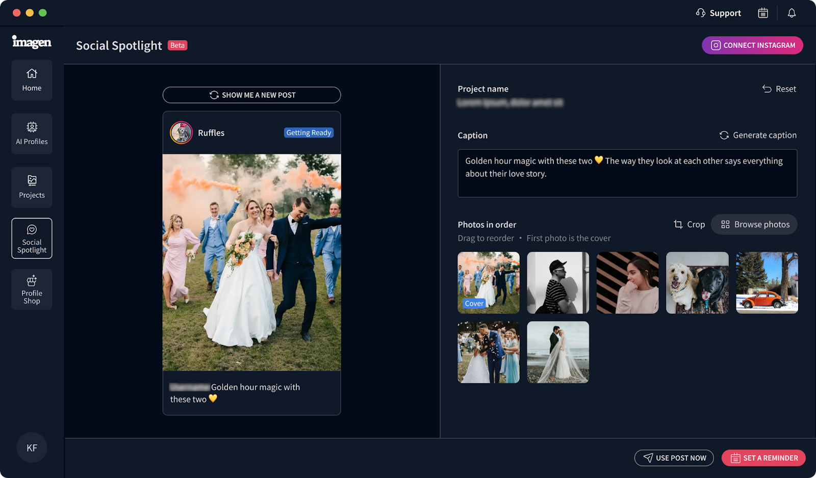 You can now schedule a post to publish automatically on Instagram. If you let Social Spotlight schedule it, it takes your scheduled posts into account and suggests the best time for you to post your new one. If you’re already using Social Spotlight, your existing calendar reminders won't auto-post, but all new scheduled posts will. Currently, Social Spotlight only supports wedding photos.
